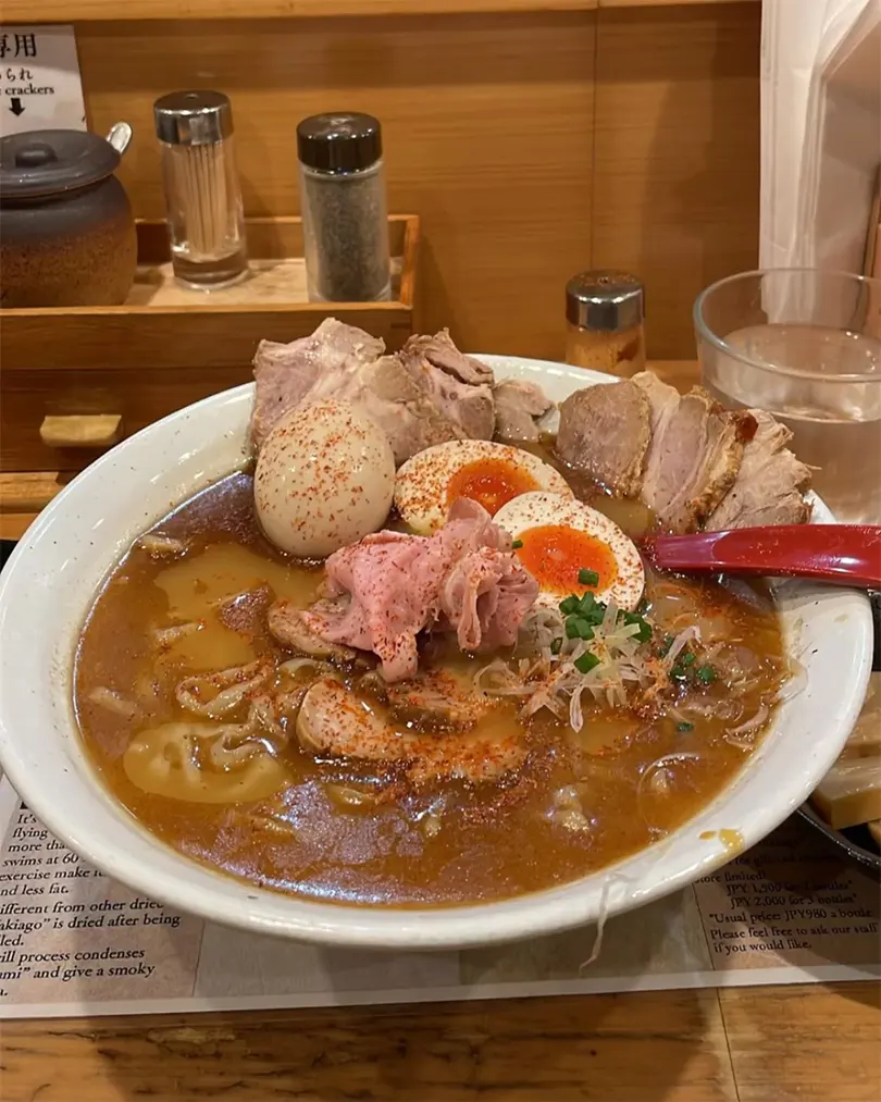 Nước dùng ở đây là một tác phẩm nghệ thuật—đậm đà, đầy hương vị và chứa đầy vị umami. Mì Ramen mặn “YAKIAGO” đặc trưng của họ (950 yên) được phủ lên trên là chashu, măng và trứng luộc mềm (+150 yên). Kiểm tra tất cả các hộp cho tôi!