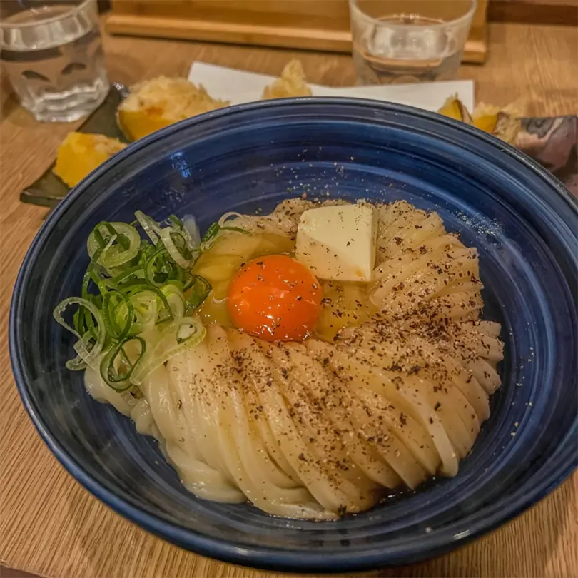 Món mì của họ là tâm điểm của chương trình—mì dày, dai và được làm tươi hàng ngày. Sợi mì làm từ lúa mì dai và có nhiều kết cấu không thể cưỡng lại được, chất lượng tươi ngon đáng kinh ngạc. Món trứng mềm, lắc lư tan chảy liền mạch trong sợi mì, hòa quyện vui vẻ với đậu nành nóng, bơ và hạt tiêu thơm ngon, phủ lên từng sợi udon một cảm giác thú vị.