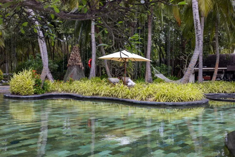 Không gian trong nhà chật chội được bù đắp bằng một bãi biển trải dài rộng rãi. Cửa kính lớn phía trước giường dẫn bạn thẳng tới hồ bơi và bãi biển riêng. Tôi nói là riêng tư, vì nó thực sự mang lại cảm giác như vậy, và với các biệt thự được bố trí hợp lý, nó có một bãi biển rộng lớn đến kinh ngạc. Nhưng một lời cảnh báo: hãy để mọi thứ bên ngoài và trời sẽ có một ít mưa miễn phí – không có một nơi trú ẩn nào trong tầm mắt.