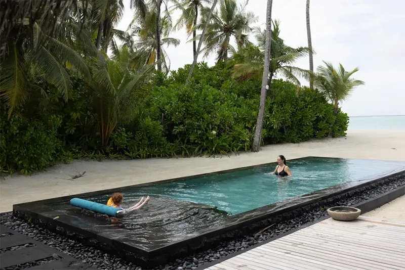 Mỗi phòng đều có trần cao và lối bài trí không gian mở với cửa trượt nhưng vẻ hùng vĩ dường như đã phai nhạt theo thời gian. Vấn đề là bây giờ mọi người đã làm điều đó tốt hơn rất nhiều. Điều này có thể không quá đáng chú ý nếu đây là lần đầu tiên chúng tôi đến Maldives, nhưng là một trong những nơi cuối cùng trong danh sách của chúng tôi, nó giống như việc sử dụng một chiếc iPhone cũ mang tính cách mạng vào thời điểm đó nhưng giờ đây được dùng làm gờ cửa để cất giữ. Babadook ra ngoài. Ở những khu nghỉ dưỡng mới hơn, bạn bước vào một khu vực sinh hoạt riêng biệt, một tính năng rõ ràng và khó chịu không có ở bất kỳ chỗ ở một phòng ngủ nào ở đây. Trả thêm tiền chỉ giúp bạn có được một hồ bơi, mà theo tiêu chuẩn của Maldives, thực sự phải đạt tiêu chuẩn. Hồ bơi phù hợp cho một vài vòng bơi và khu vực thư giãn có tựa đầu để phục hồi sau tập luyện.