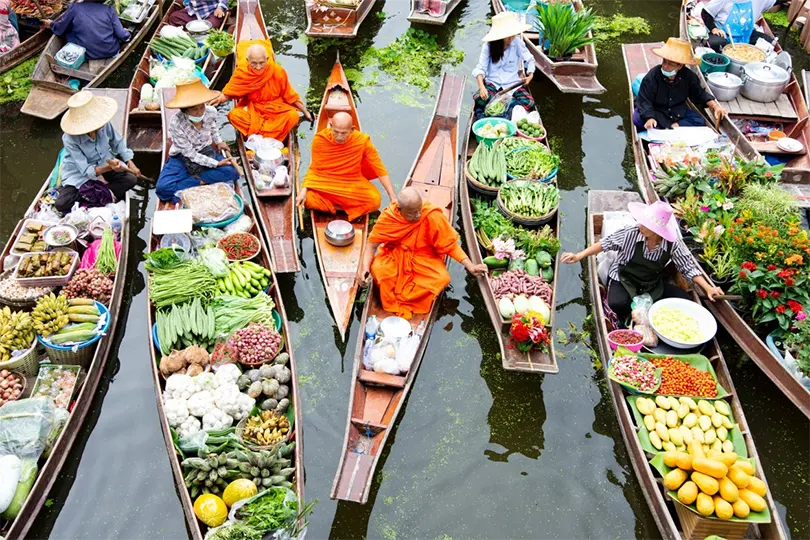 Để hiểu nhanh cách người dân địa phương mua sắm và bán hàng, hãy đến các khu chợ. Bên ngoài những tòa nhà cao tầng hào nhoáng của Bangkok là các khu ngoại ô của những khu chợ nổi, nơi những người bán hàng rong bán các mặt hàng, từ xoài tươi đến đồ ăn vặt đường phố, từ những chiếc ủng gỗ nhỏ. Một nơi khác không thể bỏ qua là Chợ đường sắt Maeklong, nơi các quầy hàng được dựng ngay trên đường ray xe lửa của một tuyến đường sắt đang hoạt động và được dọn sạch khi tàu đến gần.