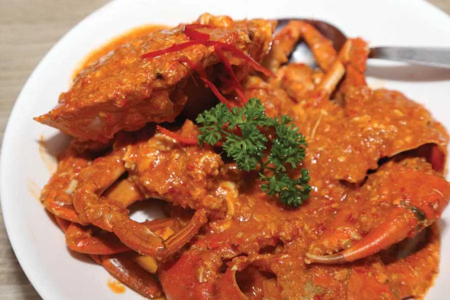 Không có danh sách món ăn Singapore nào là trọn vẹn nếu không nhắc đến món cua sốt ớt đặc trưng của Singapore. Nó không dễ dàng tìm thấy ở một trung tâm bán hàng rong nhưng có rất nhiều nhà hàng cung cấp dịch vụ tương tự. Thật là mỉa mai, bởi vì mặc dù được gọi là cua ớt nhưng hương vị của nó lại ngọt và thơm hơn là cay. Cua bùn được nấu trong nước sốt đặc với trứng, tương ớt, sốt cà chua và cà chua. Khi ăn cua sốt ớt Singapore, bạn sẽ phải bối rối vì món này ngon nhất là ăn bằng tay và nước sốt thơm lừng đó phải được chấm bằng bánh bao Mantou mới làm hoặc bánh bao hấp.