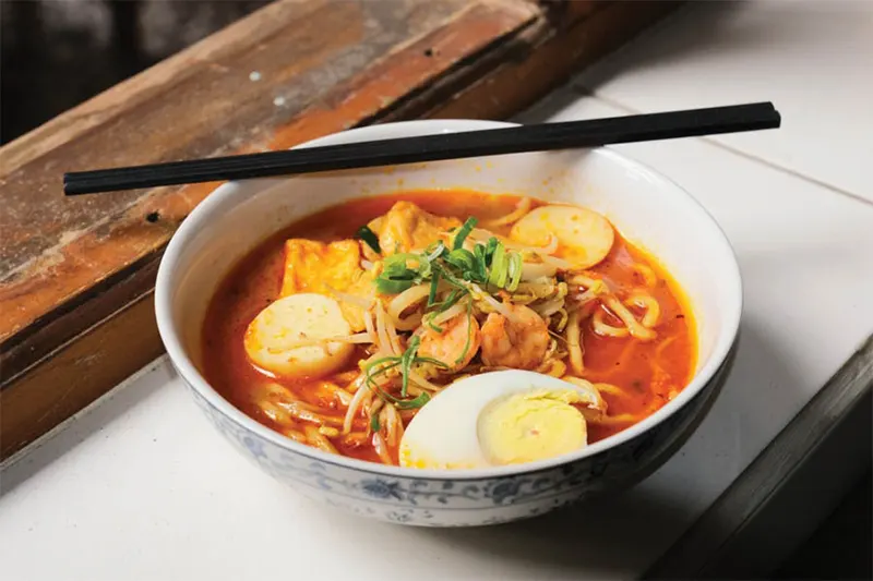 Bữa ăn đựng trong bát này là món ăn dễ chịu trong mỗi ngụm. Món cà ri kem nước cốt dừa với mì gạo cắt nhỏ và phần lớn hải sản đang là món ăn thịnh hành ở Singapore. Nó hơi khác so với laksa ở Penang (Malaysia) và thường được gọi là Katong laksa hoặc phiên bản Singapore, béo hơn và ít thơm hơn so với laksa của Malaysia và ăn bằng thìa súp và đũa.