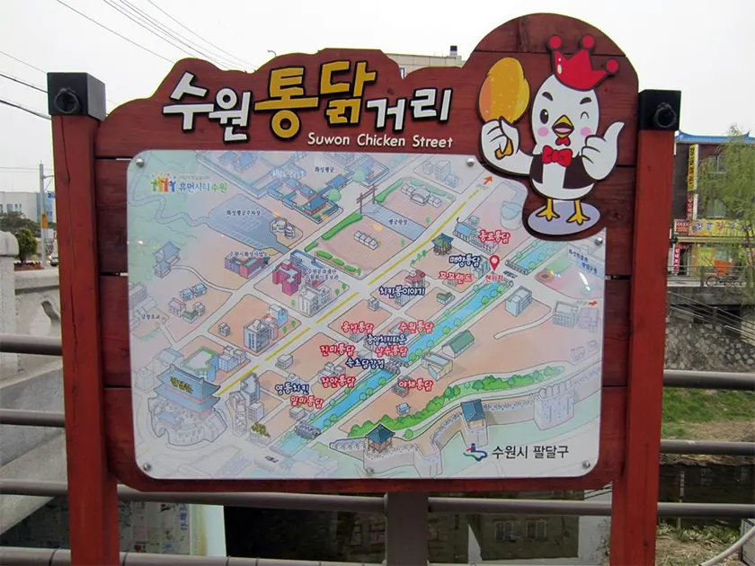 Những người đam mê gà rán sẽ có một ngày dã ngoại khi ghé thăm con phố này ở Suwon, Hàn Quốc! Tọa lạc tại Chợ Paldalmun trong khu Haenggung-dong, Phố Gà Suwon nổi tiếng với cả du khách địa phương và quốc tế. Đúng như tên gọi của nó, con phố này nổi tiếng với nhiều nhà hàng gà bán gà rán truyền thống kiểu Suwon thơm ngon, được gọi là tongdak kiểu Suwon.