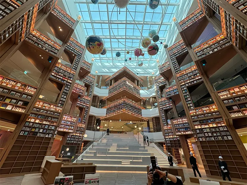 Một trong những cơ sở nổi tiếng nhất của Starfield Suwon là Thư viện Starfield Suwon trang nhã. Thư viện đồ sộ, rực rỡ này nằm từ tầng 4 đến tầng 7 và có chiều cao 22 mét. Những con mọt sách chắc chắn sẽ yêu thích địa điểm đọc sách ấm cúng này.
