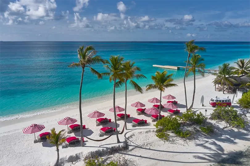 Bãi biển đầy màu sắc và biệt thự trên mặt nước, nhà hàng hợp thời trang và hồ bơi sôi động của Finolhu thu hút rất nhiều du khách quốc tế. Đây cũng là nơi có bãi cát dài nhất Maldives, trải dài hơn một km. Du khách có thể thoải mái đến bờ cát mịn màng của bãi cát, như một đường chạy bộ buổi sáng, một địa điểm dã ngoại, một nơi để thiền hoàng hôn, đêm chiếu phim ngoài trời hoặc ngắm sao. Bãi cát cũng là nơi bạn sẽ tìm thấy Crab Shack, nơi phục vụ gà piri-piri, salad đu đủ và những chai rượu vang hồng ướp lạnh cho bữa trưa và bữa tối. Điểm nhấn của tuần là bữa tiệc trang phục trắng ấn tượng, được tổ chức vào lúc hoàng hôn, với các DJ, nghệ sĩ nhào lộn, vũ công đi cà kheo và một chương trình biểu diễn lửa bắt mắt.