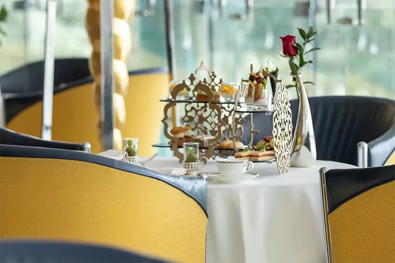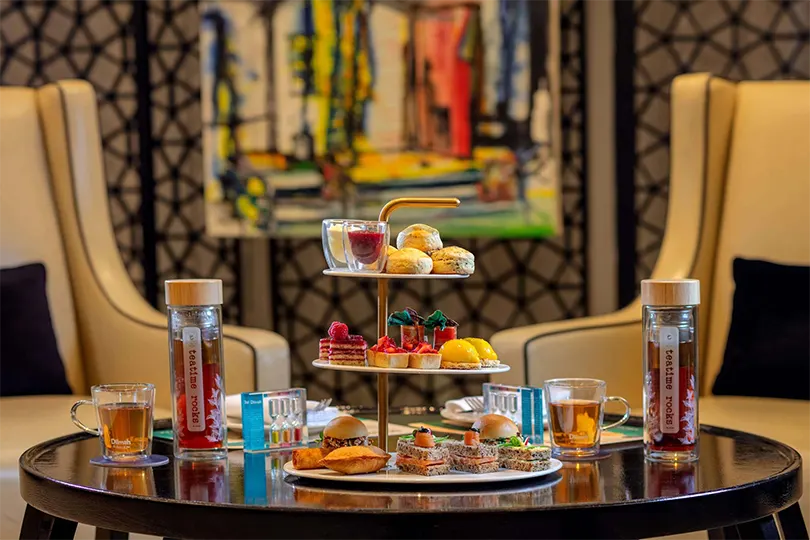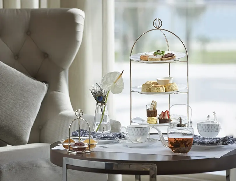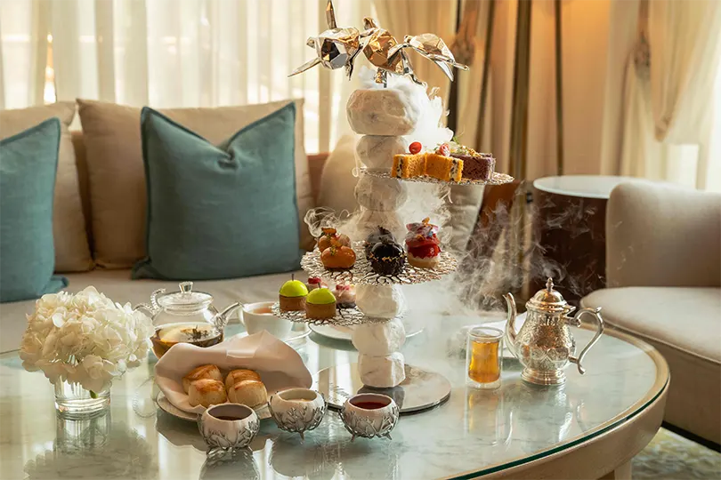 Tại Dubai, hãy thưởng thức trà chiều sang trọng tại một phòng trà tinh tế. Hợp tác với Bếp trưởng bánh ngọt Christophe Devoille, họ cung cấp đồ ăn nhẹ và đồ giải khát cả ngày có nguồn gốc từ những nguyên liệu tốt nhất, bao gồm mật ong, chà là và sữa địa phương, đảm bảo hương vị hấp dẫn khó cưỡng cho thực khách.