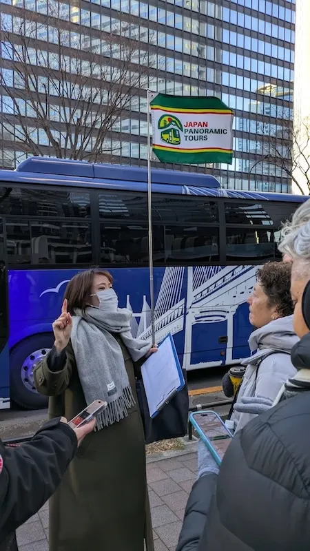 Lúc 7:40 sáng, một người phụ nữ cầm biển báo màu xanh lá cây đến – tôi nhận ra biển báo đó là biển báo của Japan Panoramic Tours, đây là công ty điều hành tour của chúng tôi thông qua Viator. Tiến triển rồi! Tuy nhiên, đó không phải là tour của chúng tôi. Đúng công ty du lịch, sai tour.