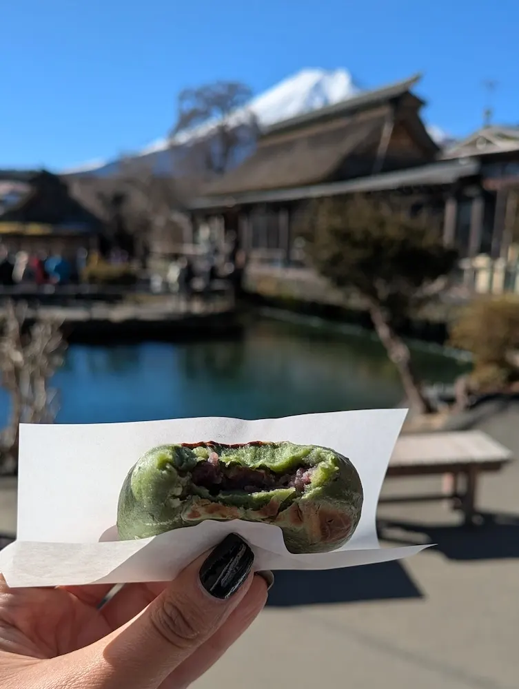 Khi chúng tôi đến ga, có rất nhiều người đang cố gắng chụp một bức ảnh tương tự với Núi Phú Sĩ ở phía sau. Thay vào đó, chúng tôi đi về phía ao cá lớn để tìm vòi phun nước tuyết của Núi Phú Sĩ.