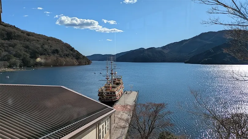 Hướng dẫn viên của chúng tôi nói rằng chúng tôi nên đi ở phía bên trái của thuyền để ngắm Cổng đền Hakone. Chuyến đi tour du thuyền kéo dài khoảng 40 phút và chúng tôi phải xuống ở điểm dừng thứ hai.