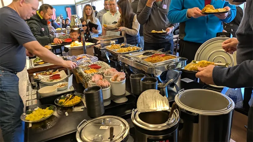 Mọi người từ hai nhóm du lịch đã dùng bữa trưa theo kiểu tự chọn trong căn phòng nhỏ này và không rõ hàng đợi đến quầy tự chọn bắt đầu hay kết thúc ở đâu. Vì vậy, chúng tôi chỉ đợi những người khác lấy đồ ăn trước khi xếp hàng để chúng tôi có thể dễ dàng biết được hàng đợi ở đâu và cách xếp hàng như thế nào.