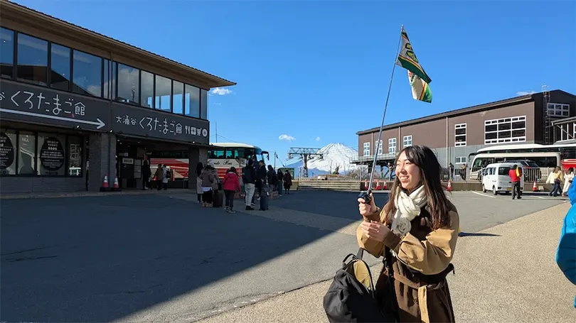 Lúc 9:30 sáng, chúng tôi đến ga và xuống xe buýt. Chúng tôi đi theo hướng dẫn viên của mình, người cầm một lá cờ để chúng tôi có thể dễ dàng nhìn thấy cô ấy từ xa. Trong khi đi bộ về phía ga, chúng tôi đã nhìn thấy rất nhiều quang cảnh đẹp của Núi Phú Sĩ.